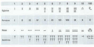 No início da história da escrita de algumas civilizações como a egípcia, a babilônica e outras, os primeiros nove números inteiros eram anotados pela repetição de traços verticais.