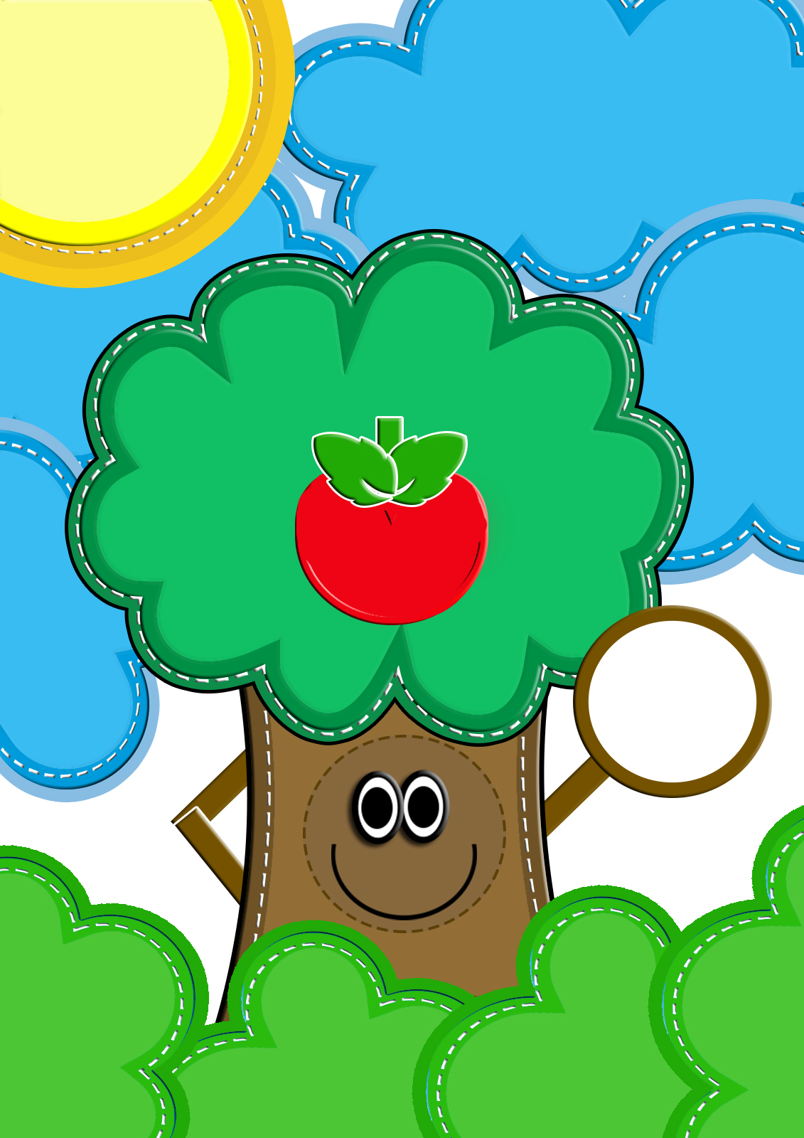 Isso mesmo!A paisagem vai ficar do jeitinho que você preferir!Aqui, Dona Árvore vai ganhar muitos amiguinhos!Senhor Sol, Senhor Jardim, Dona Nuvem e suas amigas…Vamos lá?