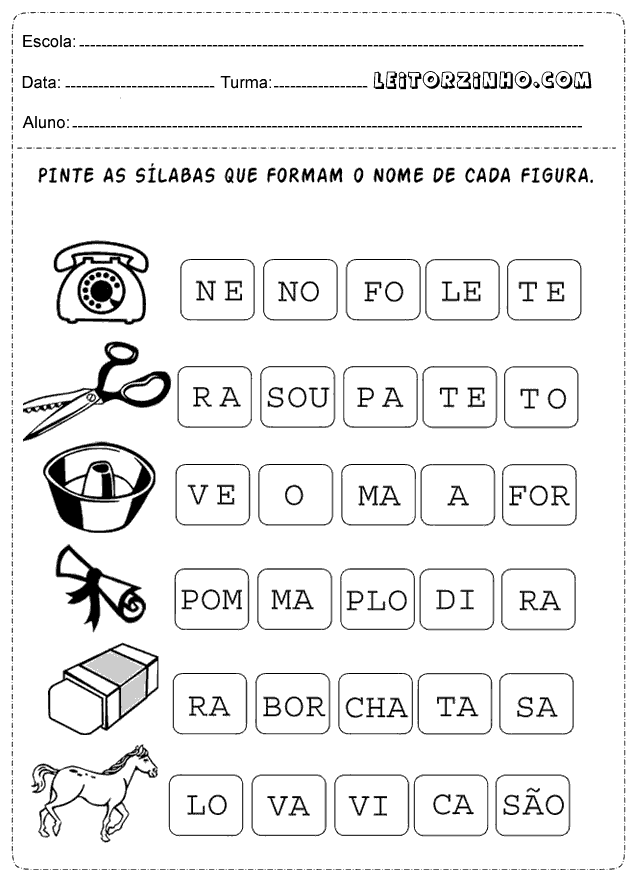 | Pinte as sílabas que formam o nome de cada figura |