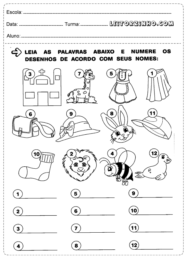 Leia as palavras e numere os desenhos de acordo com seus nomes