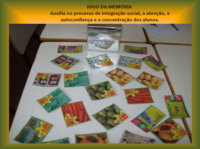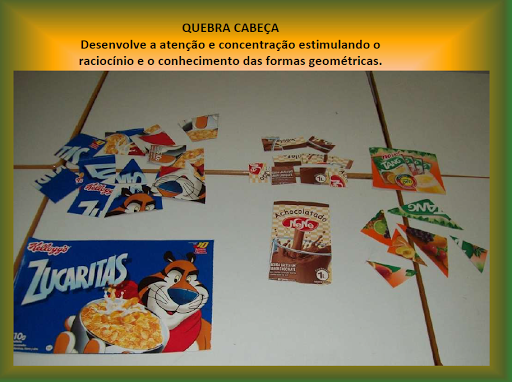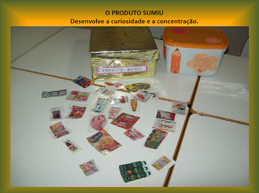 *Adequar a faixa etária da criança, colocando alguns recortes de panfletos ou rótulos em uma caixa. Pedir que a criança observe, manipule o material. Após, sem ela ver, deverá ser retirado um rótulo da caixa para que ela tente descobrir qual foi. Poderão serem dadas dicas.