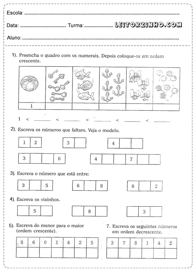 | Preencha o quadro com os numerais. Depois coloque-os em ordem crescente |