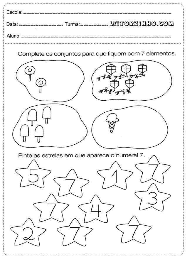 Atividades de matemática para o 1° ano do ensino fundamental que fala sobre complete os conjuntos para que fiquem com 7 elementos, pinte a estrela que aparece o número 7, ditado dos números de 0 à 10, escreva quantos degraus tem a escada, escreva o menor número e o maior em ordem crescente.