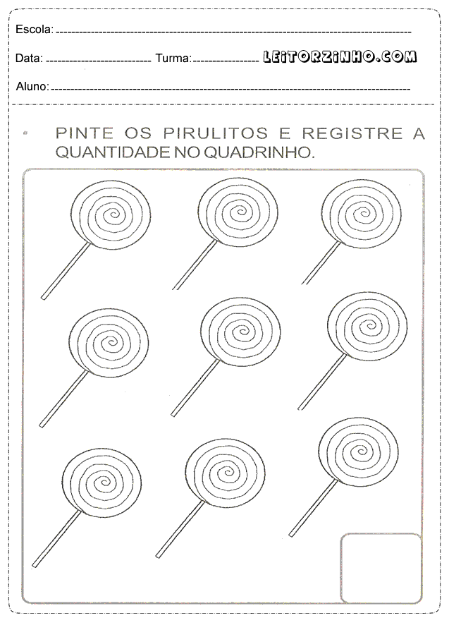 | Pinte os pirulitos e registre a quantidade no quadrinho |