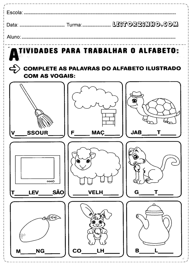 | Complete as palavras do alfabeto ilustrado com as vogais |