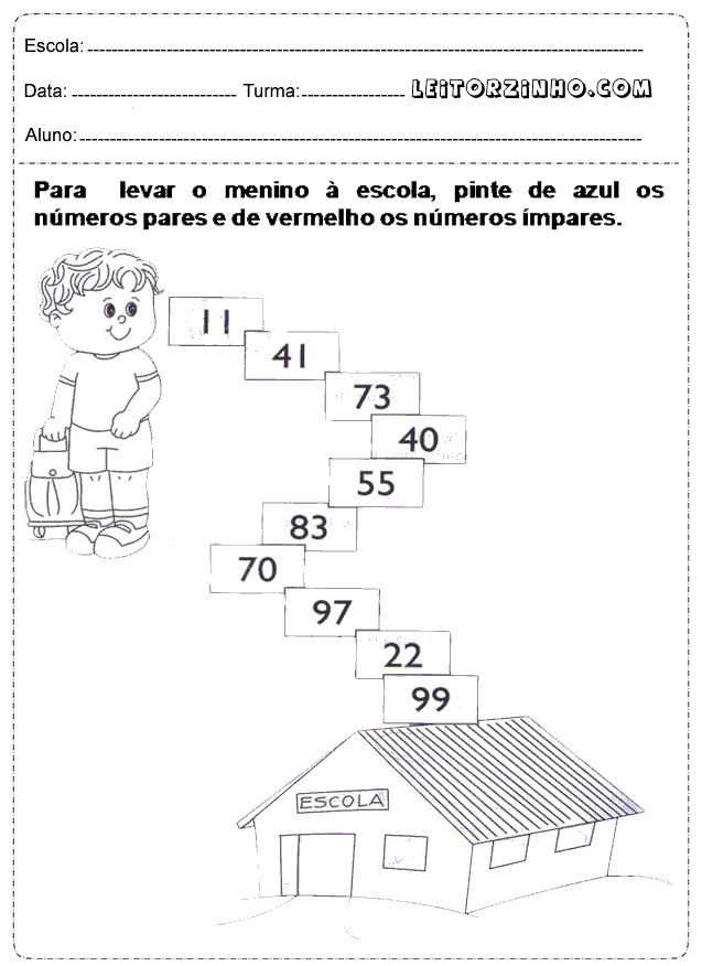 | Para levar o menino a escola, pinte de azul os números pares e de vermelho os ímpares |