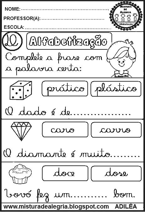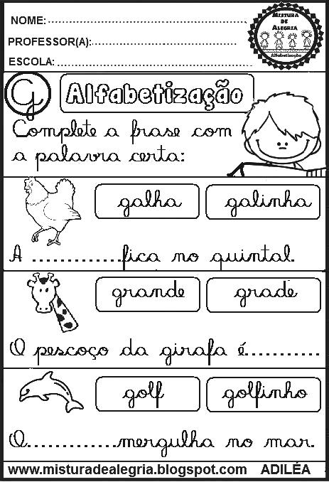 Boa tarde meus amigos! Hoje eu trago para vocês estas atividades educativas para alfabetização – frases. Os alunos vão ler as palavras e escolher a palavra adequada que forma a frase corretamente.