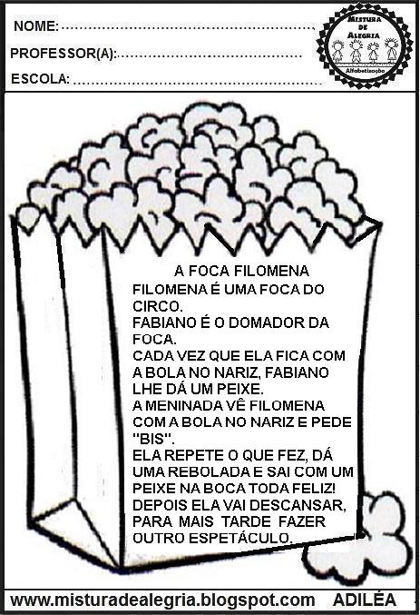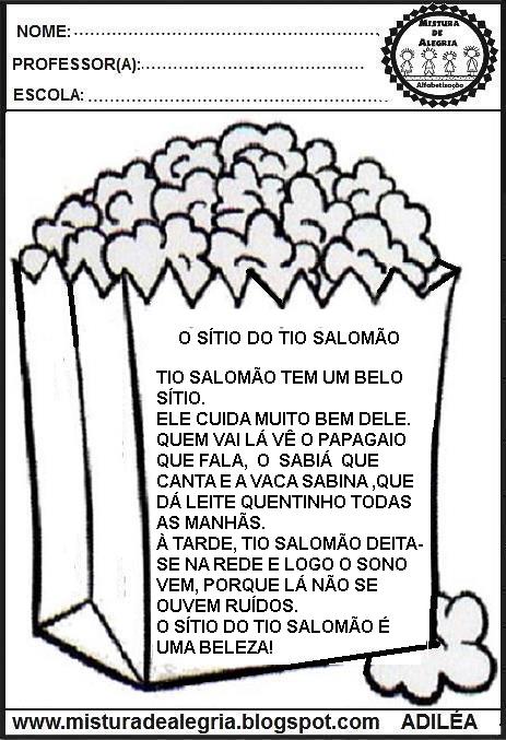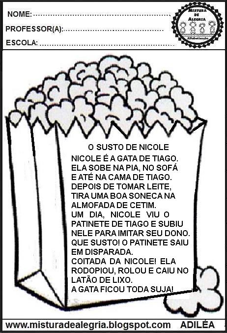 Com estas atividades interativas para educação infantil, os alunos vão ler 8 leituras ou seja pequenos textos para alfabetização 1o ano. Escolhi o desenho da pipoca para lembrar do clima de festa junina, mas poderão escolher outro desenho.