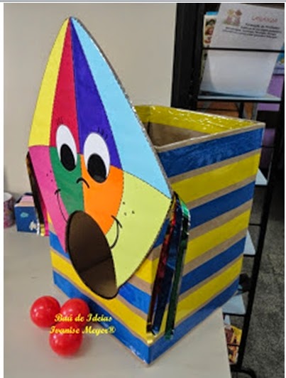 Super fácil é só enfeitar uma caixa bem colorida, pregar um balão na frente da caixa e fazer um corte oval no balão no formato da boca.
