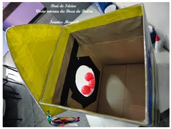 Super fácil é só enfeitar uma caixa bem colorida, pregar um balão na frente da caixa e fazer um corte oval no balão no formato da boca.