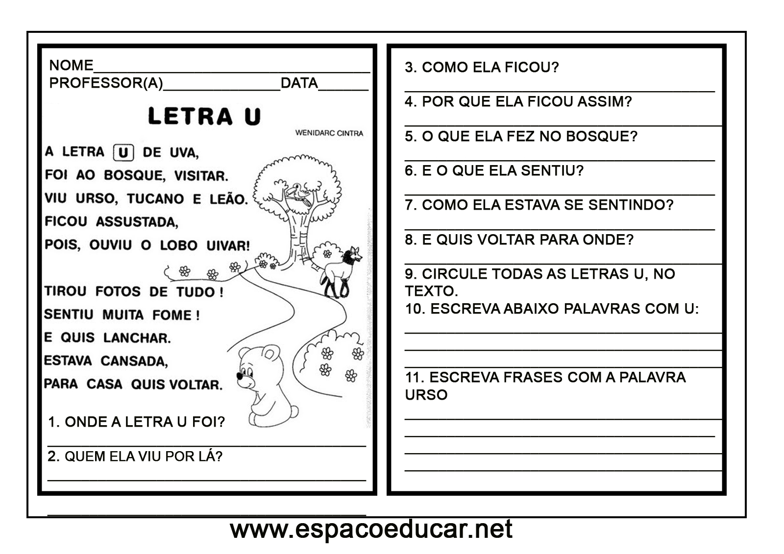O caderno contém pequenos textos, com cada letra do Alfabeto, e uma pequena interpretação, para que possam compreender o texto lido. A capa do caderno encontra-se também ao final, para ser utilizada, caso o professor prefira montar completo, com a turma. Veja abaixo todas as páginas.