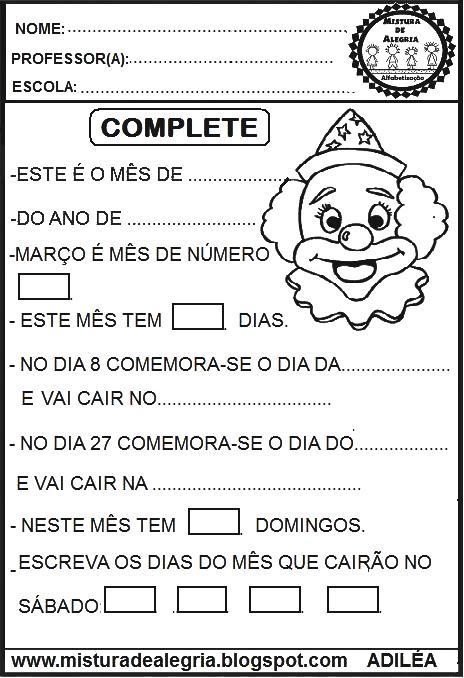 É o calendário do mês de março, para que os alunos possam colorir no dia-a-dia. Neste mês comemora-se o dia da mulher, dia do circo e início do outono.