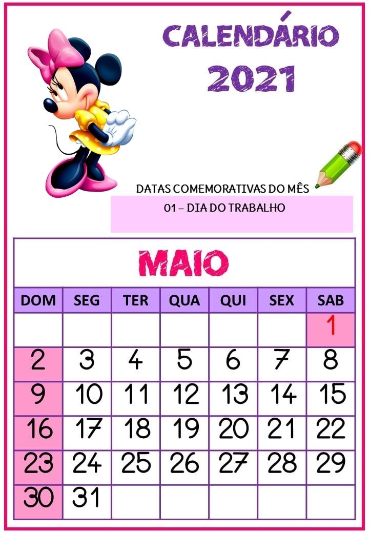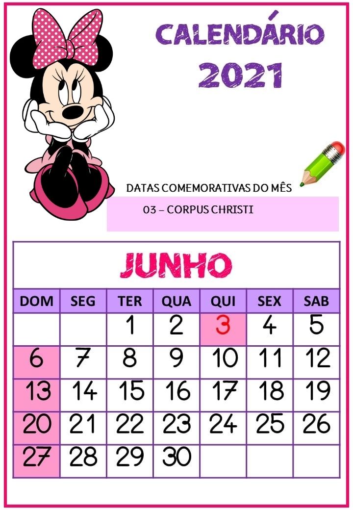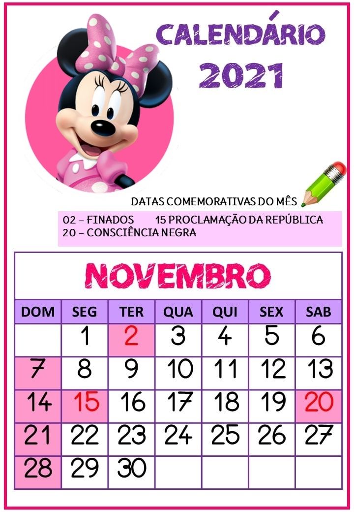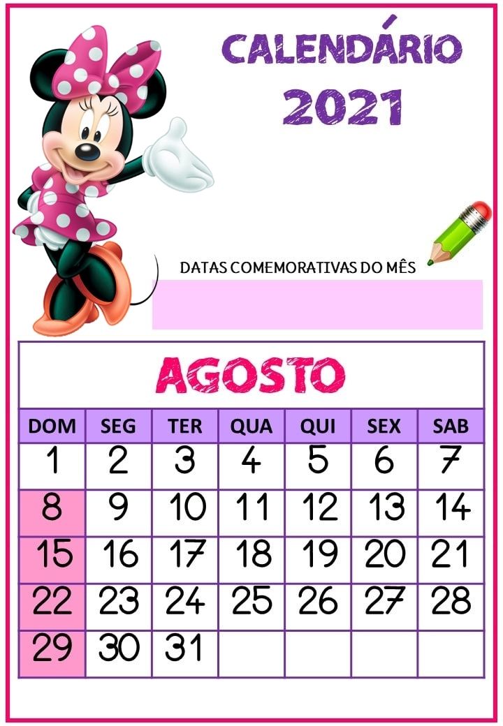 Calendário 2021 da Minnie rosa pronto para imiprimir