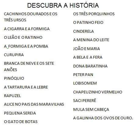 Jogo elaborado pela professora Aninha Vanderley… A professora ou alguma criança lê um trecho de uma história que deverá ser descoberto o título pelos alunos…