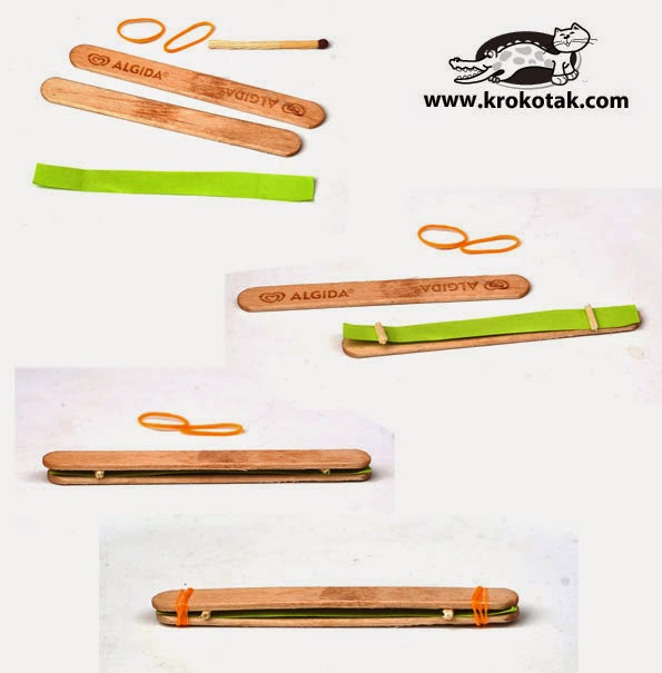 Com um palito de picolé  na mesa, cubra a tirinha. Em cada ponta um pedaço de palito de fósforo e cubra com o 2 palito de picolé.  Junte os palitos com uma liga em cada lado.