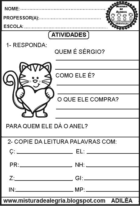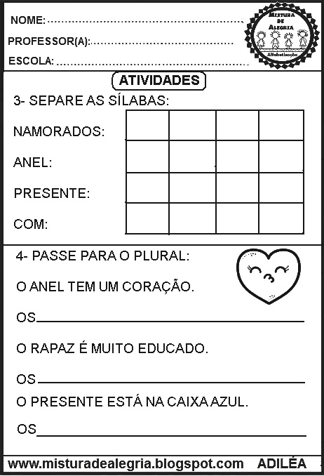 As atividades são de interpretação, separação silábica, formação de palavras, formação de frases, plural e produção de bilhete.