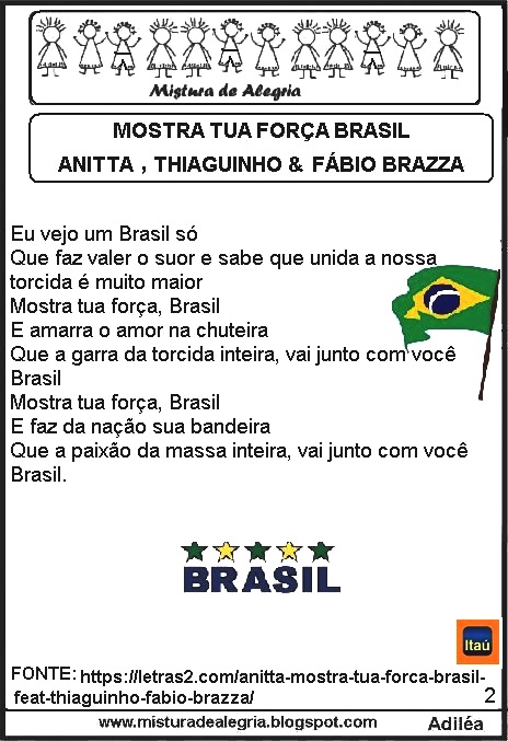 Vejam o que acabei de fazer! Esta é a música do itaú para a seleção brasileira,copa mundial de 2018. Vamos cantar, torcer, vibrar e aplaudir os gols da nossa seleção. Vai lá Brasil! Atividades sobre a copa mundial de 2018, CLIQUE AQUI…