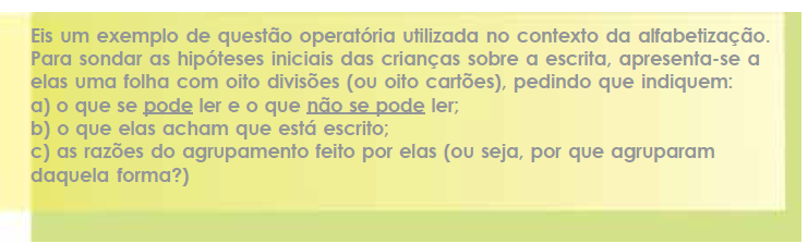 b) Provas operatórias: instrumentos assim designados devido a sua ênfase em operações mentais envolvidas nos conhecimentos que estão sendo processados pelos alunos, ao longo de seu desenvolvimento e de suas aprendizagens. Os focos desse tipo de avaliação se voltam, portanto, para representações, conceitos, conhecimentos, capacidades ou estratégias de