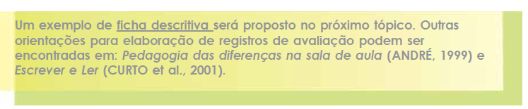 a) Observação e registro: procedimentos fundamentais ao longo do processo de aprendizagem, desde o momento de diagnóstico dos conhecimentos prévios dos alunos em relação ao sistema de escrita, até as avaliações das capacidades desenvolvidas em determinada etapa de sua trajetória, na série ou no ciclo. Exigem clara definição de focos, situações ou contextos, bem como elaboração de roteiros e seleção de recursos mais adequados ao registro