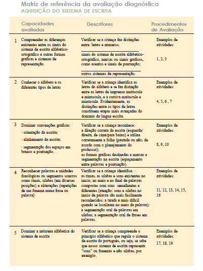 É importante que se considere a matriz de referência apenas como uma baliza para professores e especialistas do período de alfabetização, sem pretensões de esgotar o repertório de capacidades ou de procedimentos possíveis para avaliação. Também é importante considerar que a matriz poderá servir à avaliação de alunos dos três primeiros anos do Ensino Fundamental, pois apresenta capacidades progressivas e diferenciadas quanto ao grau de