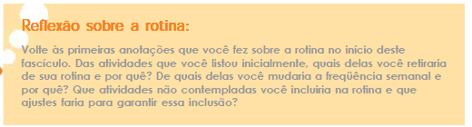construção de uma rotina torna-se relevante. O fato de o dia-a-dia e a semana escolares serem compostos por momentos diversos, possibilita à professora e às crianças organizarem-se para as atividades, construindo os sentidos do tempo e os sentidos de seus aprendizados. Ou seja, o que