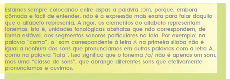 No uso falado da língua, as pessoas, em geral, cuidam apenas do assunto e não costumam dar atenção aos sons que produzem. Eventualmente, por alguma necessidade comunicativa, elas destacam e enfatizam algumas porções sonoras das palavras, por exemplo, escandindo as sílabas ou brincando com rimas e aliterações. No entanto, para aprender a ler e escrever com autonomia, o requisito indispensável é ser capaz de operar racionalmente com unidades sonoras de apreensão mais difícil – os fonemas – e com as complexas relações entre os fonemas e o modo de representá-los graficamente.