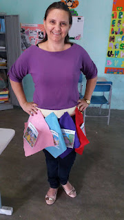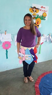 A saia foi feita de feltro, com o cós fechado com velcro, assim como cada babado, que tbm foram feitos de feltro e colados ao cós tbm por velcro, assim que o aluno escolher qual história deseja ouvir, o professor destaca o babado do velcro e estende-o no tapete para iniciar a leitura.