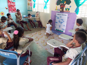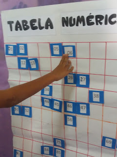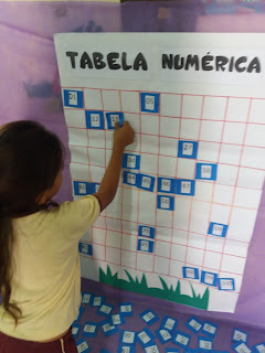 - Espalhe no tapete os números e o cartaz afixe na parede