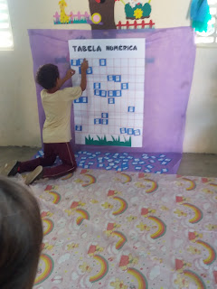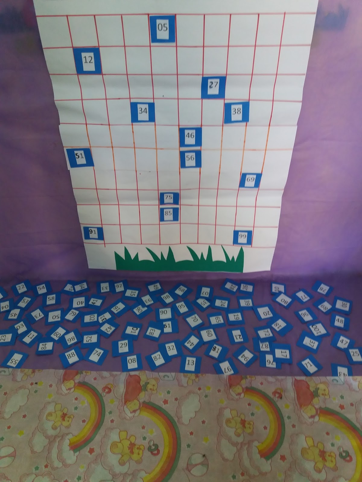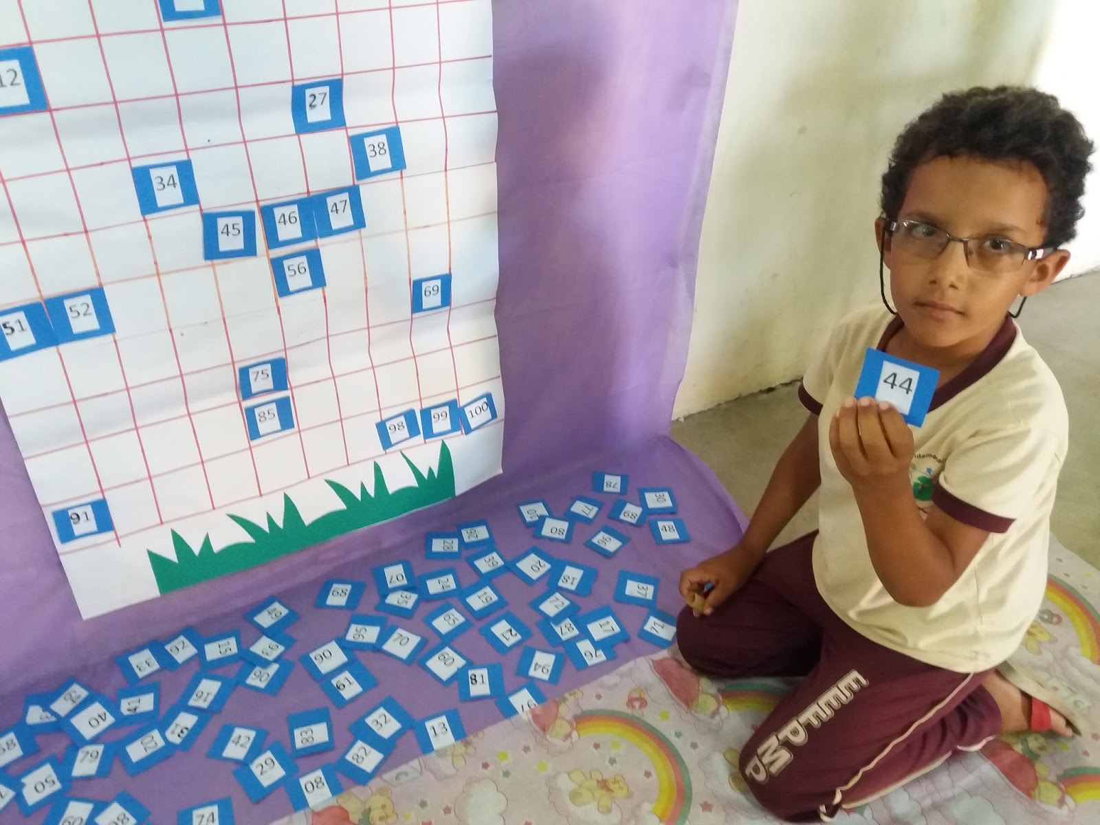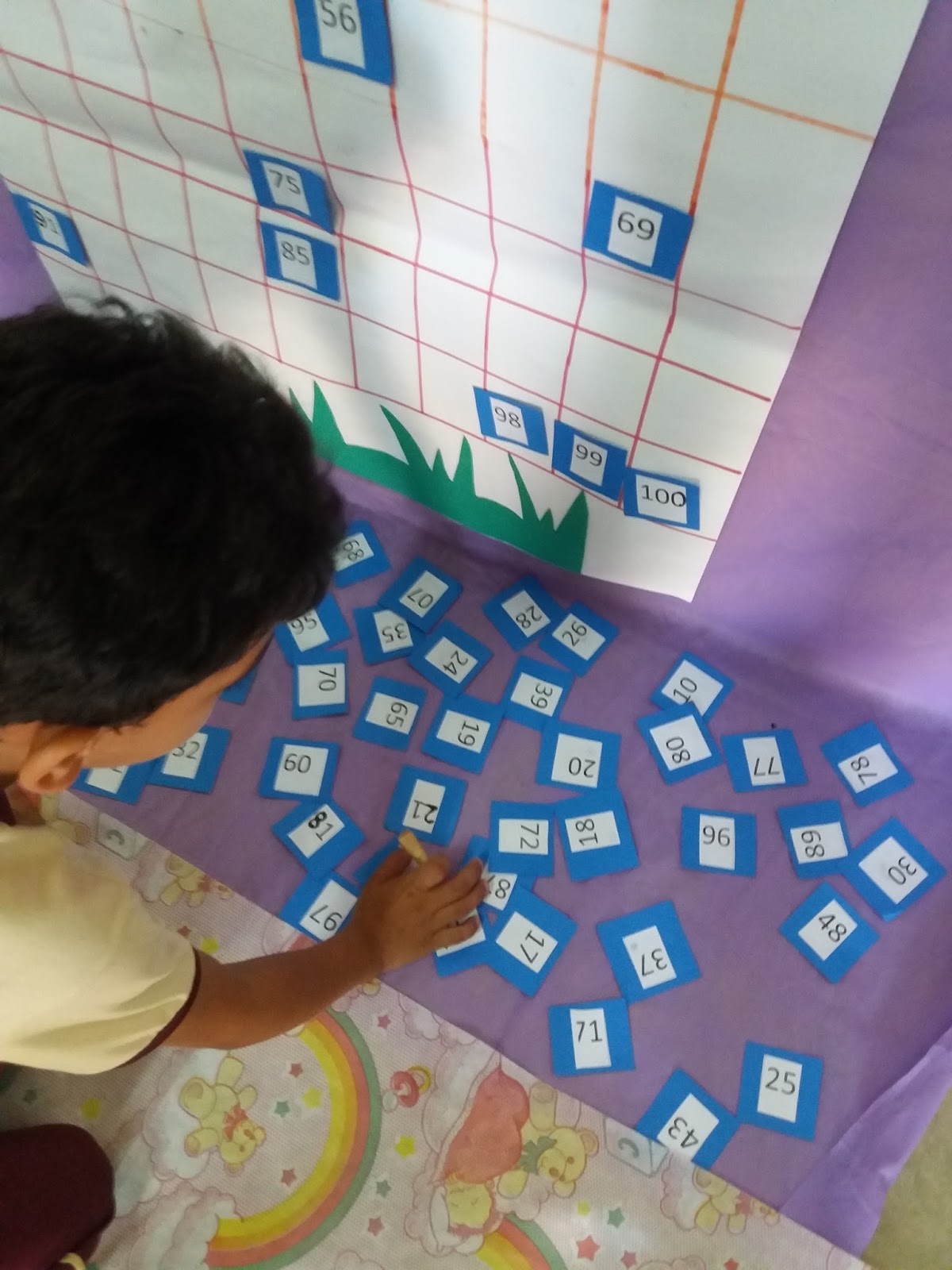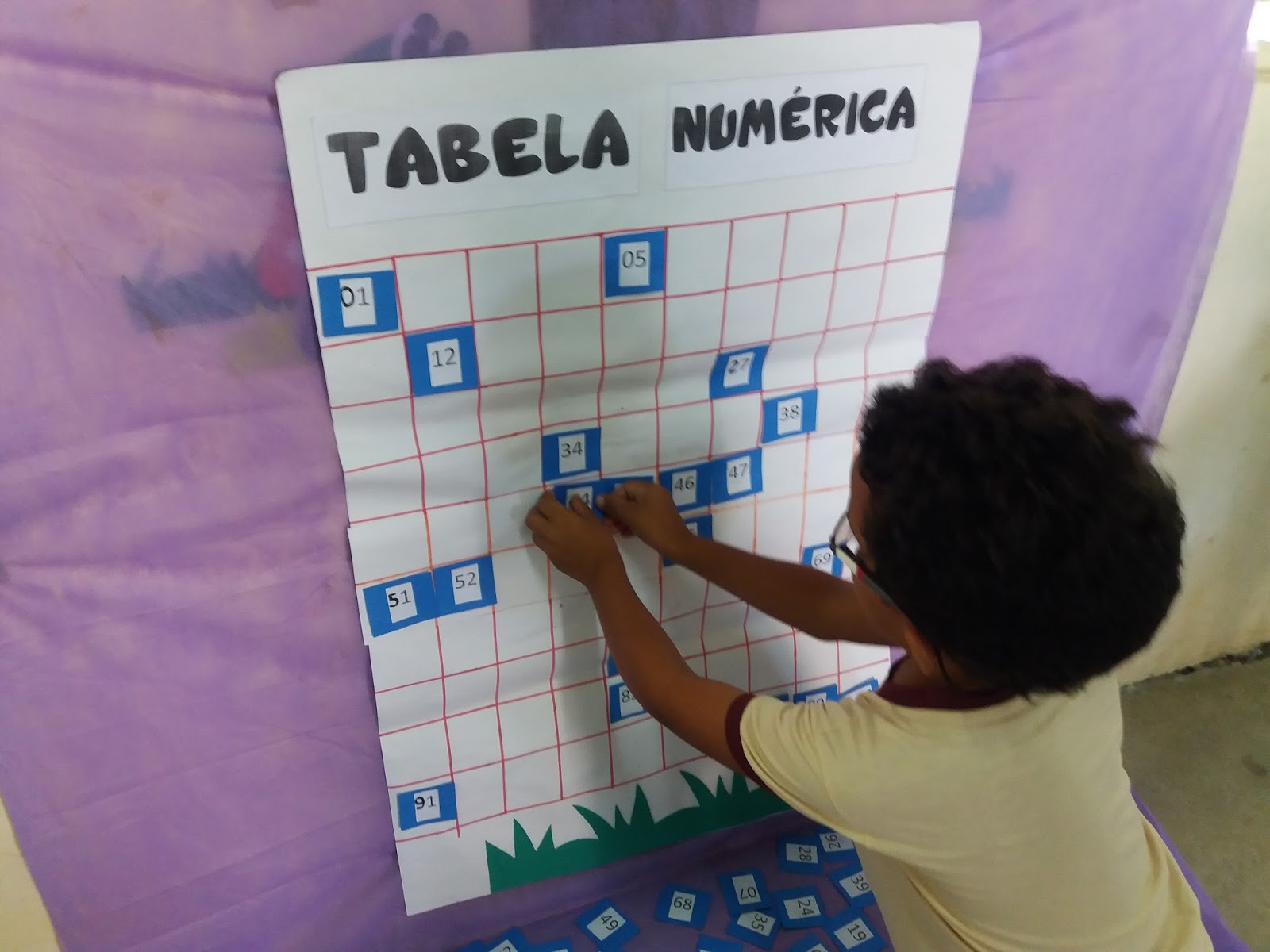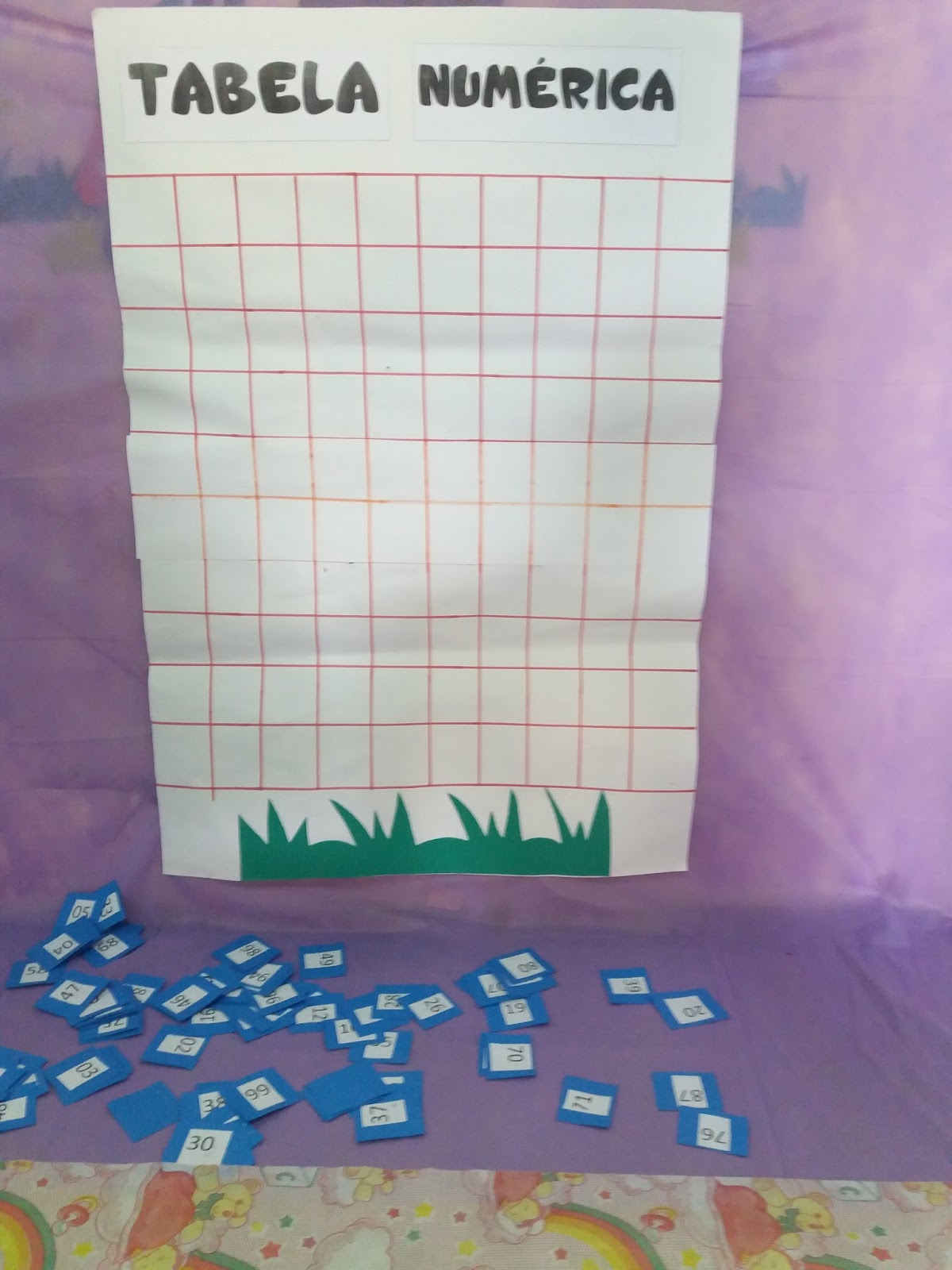 - Espalhe no tapete os números e o cartaz afixe na parede