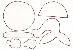 EVA nas cores branco, azul, rosa, preto, laranja, amarelo, vermelho, bege e estampado; cola quente, tesoura, caneta permanente preta, tinta PVA branca, palitinho de churrasco, araminho preto.
